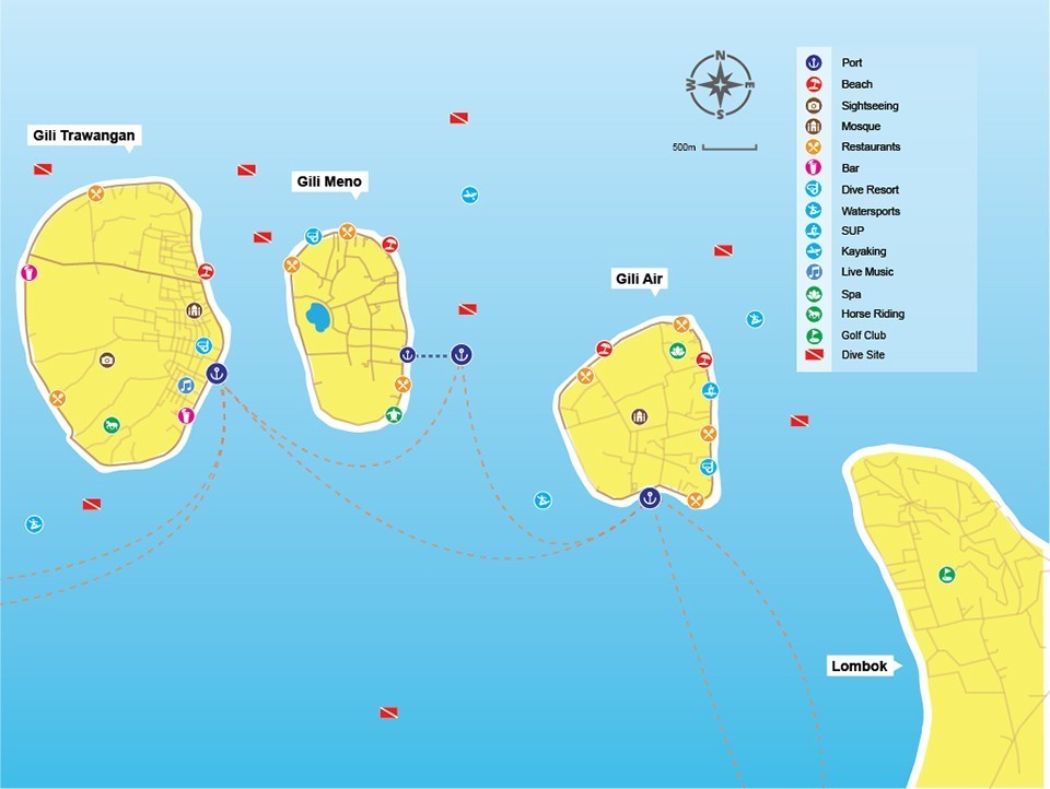- Gili Trawangan is the biggest and most visited of the three and has earned a reputation as ‘Party Island’ amongst the world’s travellers. Once a backpacker’s haven – with basic beach huts and simple bars, serving concoctions that offer ‘free lunar transport’ – Gili T has undergone some dramatic changes over the past five years and now caters to a decidedly more upmarket crowd, often with family in-tow, all seeking that tropical island experience with the luxuries of home. Aside from the laid-back beach culture, the main draw of the island is scuba diving, with a number of professional dive centres offering courses and fun dives. Watching the fishing boats passing through the channel between Gili T and Meno, plus the lack of motorized traffic still makes for a chilled out vibe - but at night time Gili T really is a partygoers paradise.